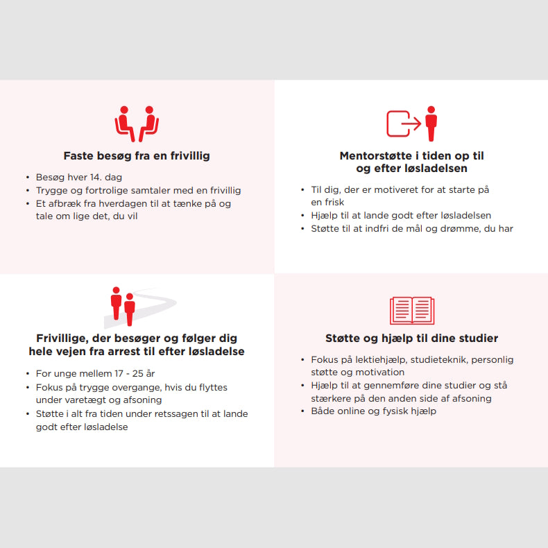 Folderen præsenterer alle indsatser i fængsels- og løsladelsesprogrammet. Den kan foldes sammen og stikkes i baglommen.